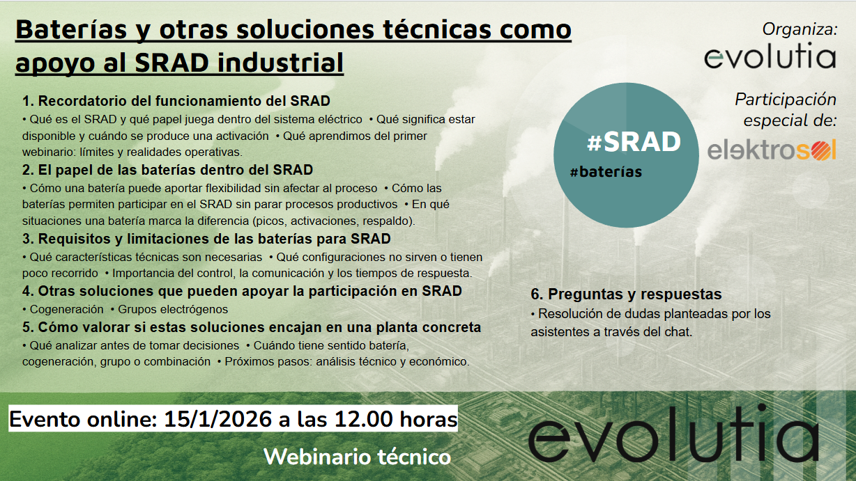Tras un primer webinario centrado en explicar el funcionamiento del SRAD, desde Evolutia damos un paso más y organizamos, junto con ELEKTROSOL, una nueva sesión enfocada en soluciones técnicas concretas: baterías, cogeneración y grupos electrógenos, y cómo pueden ayudar a cumplir con los requisitos del SRAD de forma segura y realista.